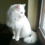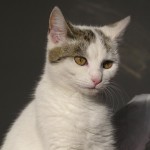 'Biała' jest drobna, mała.Ma 9 lat a wygląda na rocznego kotka. Jest cała biała, ma szary ogon i szarą łatkę na głowie.