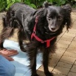 Filigranowa , czarna suczka, miała na sobie czerwone szeleczki i szarą obróżkę przeciwkleszczową. Bardzo płochliwa.Zowie się Punia.