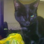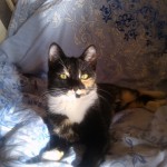 kotka-trikolorka. Sierść w przeważającej części ma czarną,po obu stronach noska przy oczach małe biało-rude plamki,na lewym policzku pod okiem dość duża ruda plamka,broda po prawej stronie biała a po lewej czarna.Biały kołnierzyk pod szyją,białe skarpetki,ogon czarny z białą końcówką,na całym...