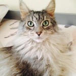 okolo 5 lat, waga okolo 3/4 kg, szaro-czarna, pregowana z rudymi "plamami", bialy kolnierz
