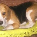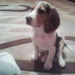 Szczeniak pięciomiesięczny tricolor beagle. Cechy charakterystyczne trzy czarne kropki nad nosem, łata na lewek przedniej łapce. Miał na sobie czerwono-niebieską obrożę.