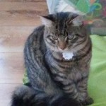 Kot ma 3 lata, jest bury, pręgowany, ma biały krawacik, charakterystyczne białe skarpety i białe pończochy, czarne poduszki stóp, żółte oczy, brązowy nos. Wykastrowany, zaczipowany, łagodny, bardzo płochliwy.
