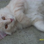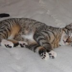 jasno-bury, pręgowany,biały krwacik, białe skarpety, czarne stopy,żółte oczy, nos brązowy, wykastrowany, ma 3 lata, łagodny.