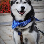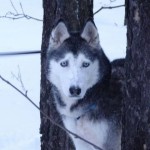 Czarno biały husky, oczy brązowe, z czarną grubą obrożą. Nazywa się Eyva.