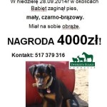 Dnia 28.09.2014r w okolicach Babięt zaginął jeden z naszych psów - Malu. Jest to młody, nieduży (ok. do połowy łydki) czarno-podpalany mieszaniec w typie gończym. Miał na sobie zieloną obrożę i zawieszkę z numerem Tasso. Pies jest zachipowany. Właścicielką Malu jest Anja - pochodząca z Niemiec...