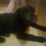 Czarny Labrador z białą łatką na szyi, ma obrożę czerwoną z wisiorkami. wabi się VINCI
