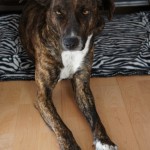 Średniej wielkości, czarna suczka z podpalanymi nóżkami i białym paskiem idącym od szyi do brzuszka. Ma czerwoną obrożę. Bardzo przyjazna i żywiołowa. Nie gryzie.