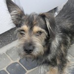mały,czarny podpalany. W dniu zaginięcia mial na sobie obrożę i szelki