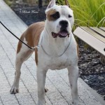 Duży, mieszaniec Amstaf w łaty, z obrożą kolorową szeroką, kastrowany, białe łapy, długie nie obcięte uszy.