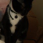 Mały, około 6 miesięczny kotek, czarny z białym krawacikiem, białymi łapkami i białymi wąsami. Ma na szyi obróżkę w zielone wzorki i czarny dzwoneczek.