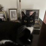 Kot szczupłej budowy, czarny z białym krawatem i podbrzuszem. Na przednich łapkach ma białe krótkie skarpetki, na tylnych dłuższe białe skarpetki z charakterystycznymi białymi "opaskami" powyżej. Ma białe wąsy i brwi
