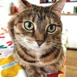 Kotek jest szary z minimalnymi pręgami na ogonie, na podbródku ma zgrubienie po kleszczu, jest przyjazny dla ludzi
