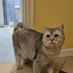 Kot Leon. jasno-szaro-biały. Dłuższe włosy i puszysty ogon. Mieszaniec Europejczyk z Norweski leśny. Bardzo grzeczny.