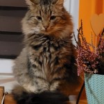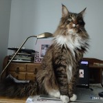 Duży kot rasy Maine Coon. Umaszczenie brązowo biało szaro czarne.