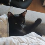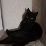 Cały czarny, ma doslownienpare bialych wloskow pod brodą: bursztynowe oczy