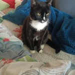 Roczna czarna kotka dachowiec z białym krawatem i łapkami