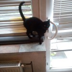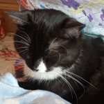 Czarna koteczka z białą plamką na nosku, białym kołnierzykiem i białym brzuszkiem. Nieufna. Wysterilizowana.
