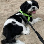Szczeniak, nieufny, czarno biały z zielonymi szelkami, włos strzyżony