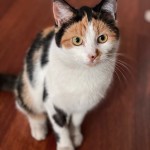 Trójkolorowa kotka, z czarną plamką na nosku.