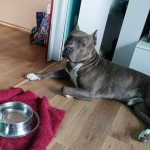 Kopiowane (obcięte uszy), ma białe skarpetki - w lewej przedniej ma ją dłuższą. Pies kastrowany z kolczatka na szyi.