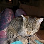 Dorosły czarny, kastrowany kocur. Posiada prześwitującą przez sierść bliznę po szczepieniu na lewym boku. Charakterystyczny chwiejny chód po przebyciu panleukopenii.