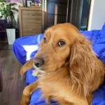 Łagodny, rudy, w typie cocer spaniela , niebieska obroża