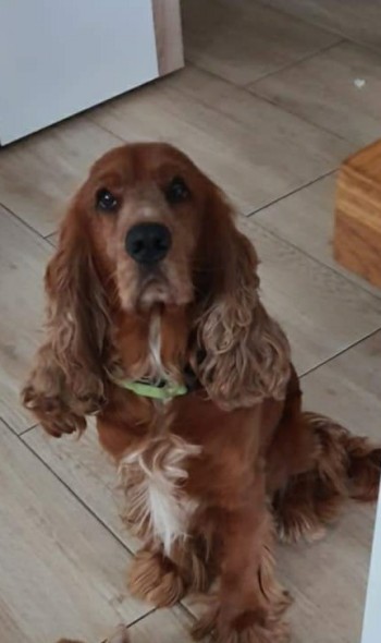 Pies koloru ciemno złotego, biały krawat, wzrost do kolan, wiek 6 lat, miłe usposobienie.