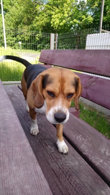 Beagle, trikolor, może kuleć na jedną łapke