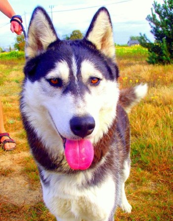 Suczka Husky, jak na zdjęciu, uciekła z domu ze swoim synem maści brązowej.