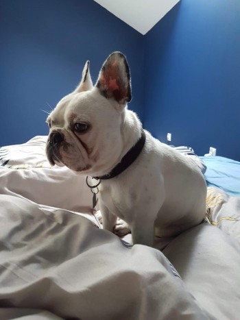 2 letni Buldog francuski , biały ze znaczeniami .Reaguje na imie Dżeki. Przyjazny dla ludzi. Chętny do zabawy