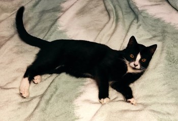 czarny kot z czterema białymi łapkami, czarnymi poduszeczkami i białym pyszczkiem