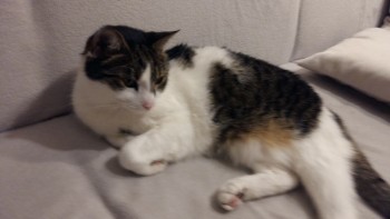 duży kot biało-szaro-czarny, długie nogi, boi się obcych