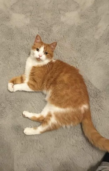 Rysiu jest rudo-białym, 8-letnim kastratem. Pod pyszczkiem ma małą rudą plamkę, a jego brzuch jest cały biały.