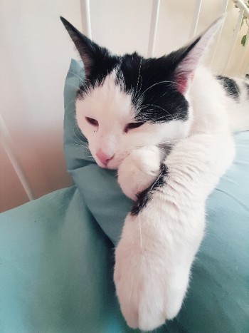 Kotka 10 lat, biała w czarne łaty. Biały pyszczek, czarne uszy i ogon, różowy nosek. Zielono żółte duże oczy. Średniej wielkości, raczej przyjazna.