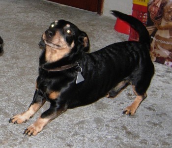 Pies rasy jamnik (mieszany)krótkowłosy czarny podpalany. Brązowa obroża z numerkiem