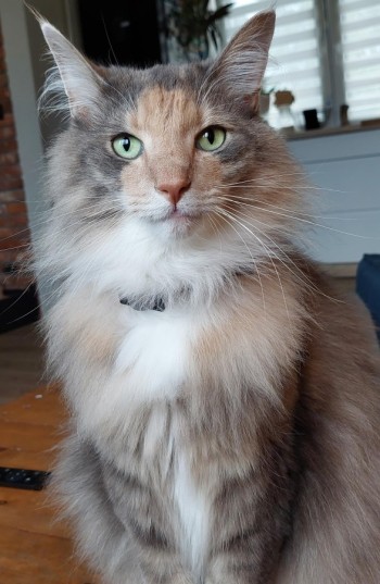 Szaro-rudo-biała kotka, spokojna, duża i puchata z charakterystycznymi frędzlami na uszach. Jest zachipowana, miała na sobie brązową obróżkę.
