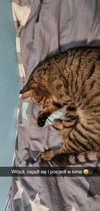 Szary kocur z pręgami czarnymi, chudy, z lekko wykrzywiona miednicą