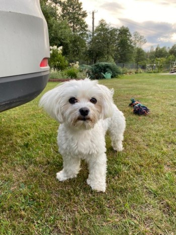 Biała suczka, maltańczyk. Wabi sie Megi.