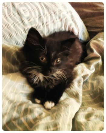 Młody kot, czarny, dymny, białe łapki, biały pędzelek na samym końcu ogona, biały krawat, reaguje na imię "Pablo", sierść dłuższa