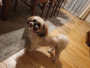 Pies koloru kremowego, ma na sobie szelki koloru niebieskiego odblaskowe, obroże z identyfikatorem , oraz obroże na kleszcze.