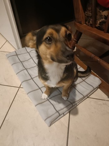czarny podpalany, białe stópki, lekko oklapnięte prawe ucho