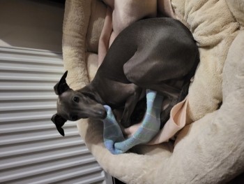 Młody 10 miesięczny charcik włoski o błękitnym umaszczeniu. W chwili zaginięcia miał na sobie bawełniany sweterek w kolorze szarym oraz brązowo beżową obrożę z ćwiekami i tabliczką z jego imieniem oraz numerem telefonu do właściciela. Jest bardzo delikatny i płochliwy.