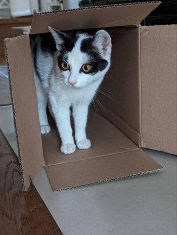 Biało czarna kotka z.charakterystyczna czarną maską na oczach..jest drobna i płochliwa