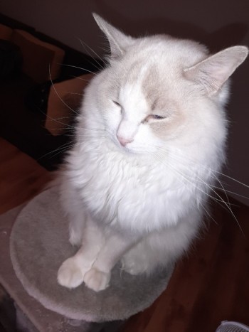 Kotek ma lekko beżowy ogon i błękitne oczy. Wymaga specjalnego karmienia że względu na problemy skórne. Kot wychodzący, nigdy się nie oddalał. Bardzo łagodny. Na kotka czeka dziecko:(
