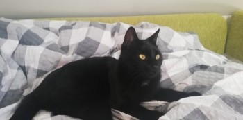 Czarny, dwa obgryzione uszka. Biały delikatny krawacik.