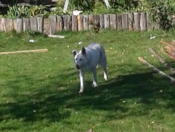 Biała sunia, staruszka 14lat. Ma wszczepionego mikroczipa lecz nie ma zawieszki ponieważ dostaliśmy błędną.