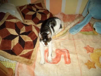 2 letnia nieduża kotka umaszczenie białe z czarnym grzbietem i ogonem,ruda plamka na brodzie. W dniu zaginięcia miała na sobie kolorową obrożę przeciwpchelną (żółto, czerwono zieloną)