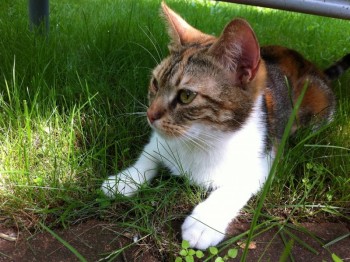 Kotka trikolorka z białym brzuchem i szyją, dość długi ogon