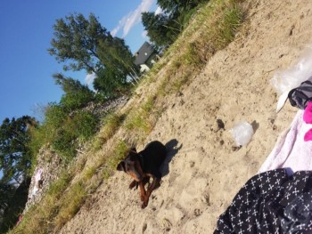 czarny podpalany,długie łapy, oklapniete uszka, krótki ogonek, gładka sierść i krótka. Reaguje na Gufi.