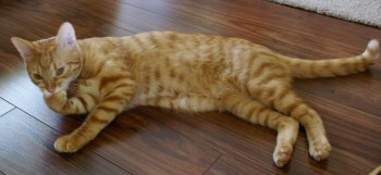Rudy kocór w pręgi tygrysie. Bardzo łagodnie usposobiony, mało miałczy. Ma dystans do obcych ale lubi ludzi. Ma rok i 2 m-ce, nazywa się Kubuś.